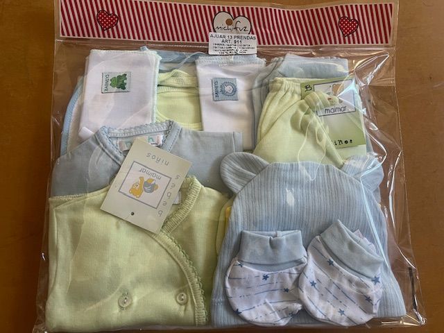 ART 911. AJUAR 13 PRENDAS. Espectacular ajuar para BB, puro algodón, de 13 prendas, compuesto por 2 batitas, 2 medio ositos, 2 baberos, 2 babitas, 2 gorritos, 2 pares de escarpines, mas una manta recibidora de 65 x 47 cms, estampada. Ideal para regalar. Superoferta!!!!!